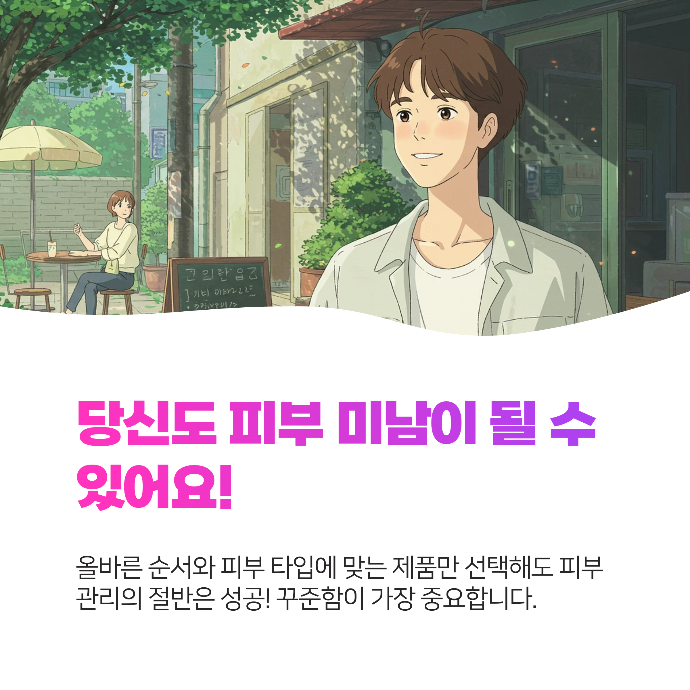 스킨케어는 순서가 생명입니다. 특히 남성 피부는 피지와 면도 자극으로 민감해지기 쉽기 때문에, 아래 순서를 기억하세요!