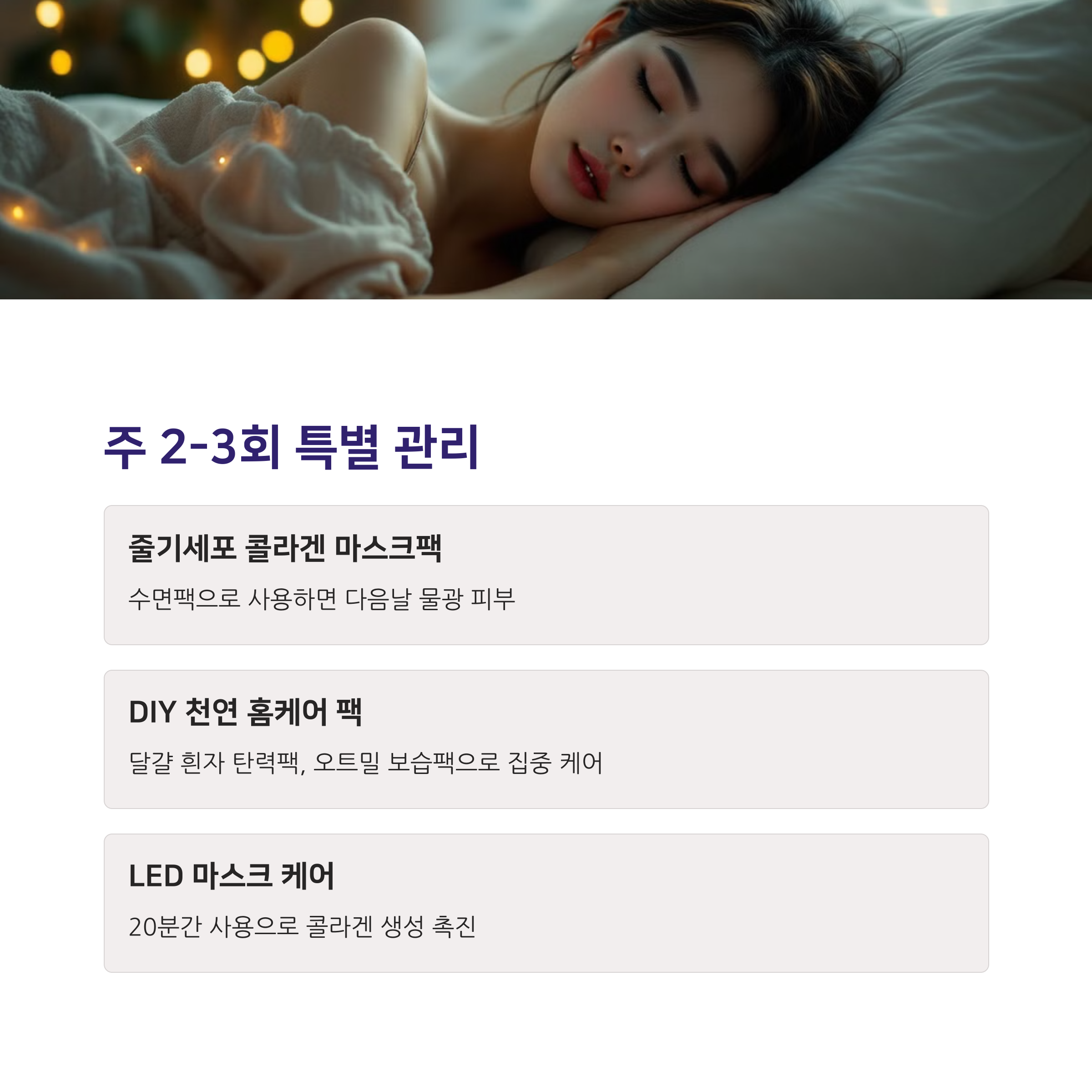 일주일에 2-3회는 이 특별 관리로 피부에 집중 케어를 해주세요. 이 단계가 2주 만에 변화를 느끼는 핵심이에요!