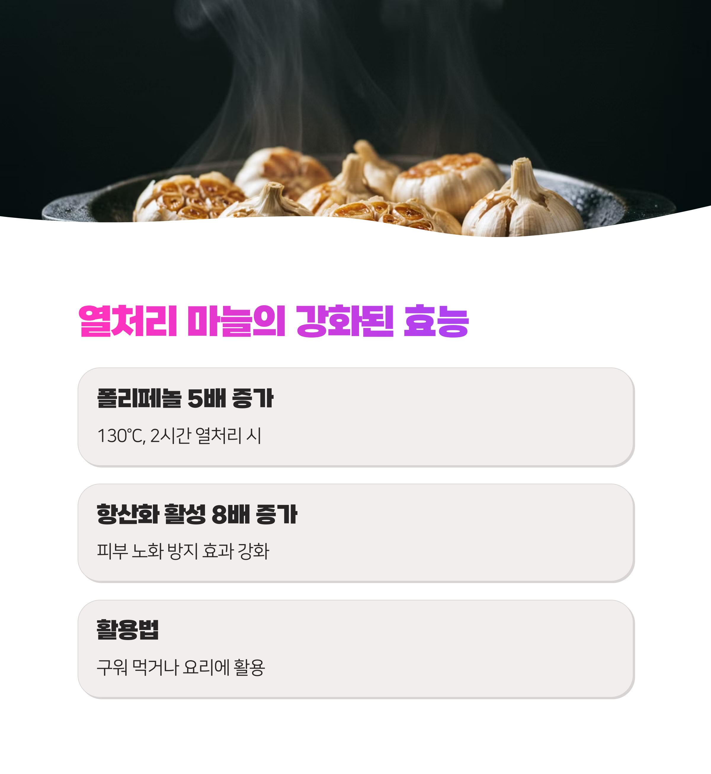 열처리된 마늘은 항산화 성분이 더욱 강화됩니다. 연구에 따르면, 130°C에서 2시간 동안 열처리한 마늘은 폴리페놀 함량과 항산화 활성이 크게 증가하여 피부 노화 방지에 더 효과적입니다. 열처리 마늘은 구워 먹거나 요리에 활용할 수 있습니다.