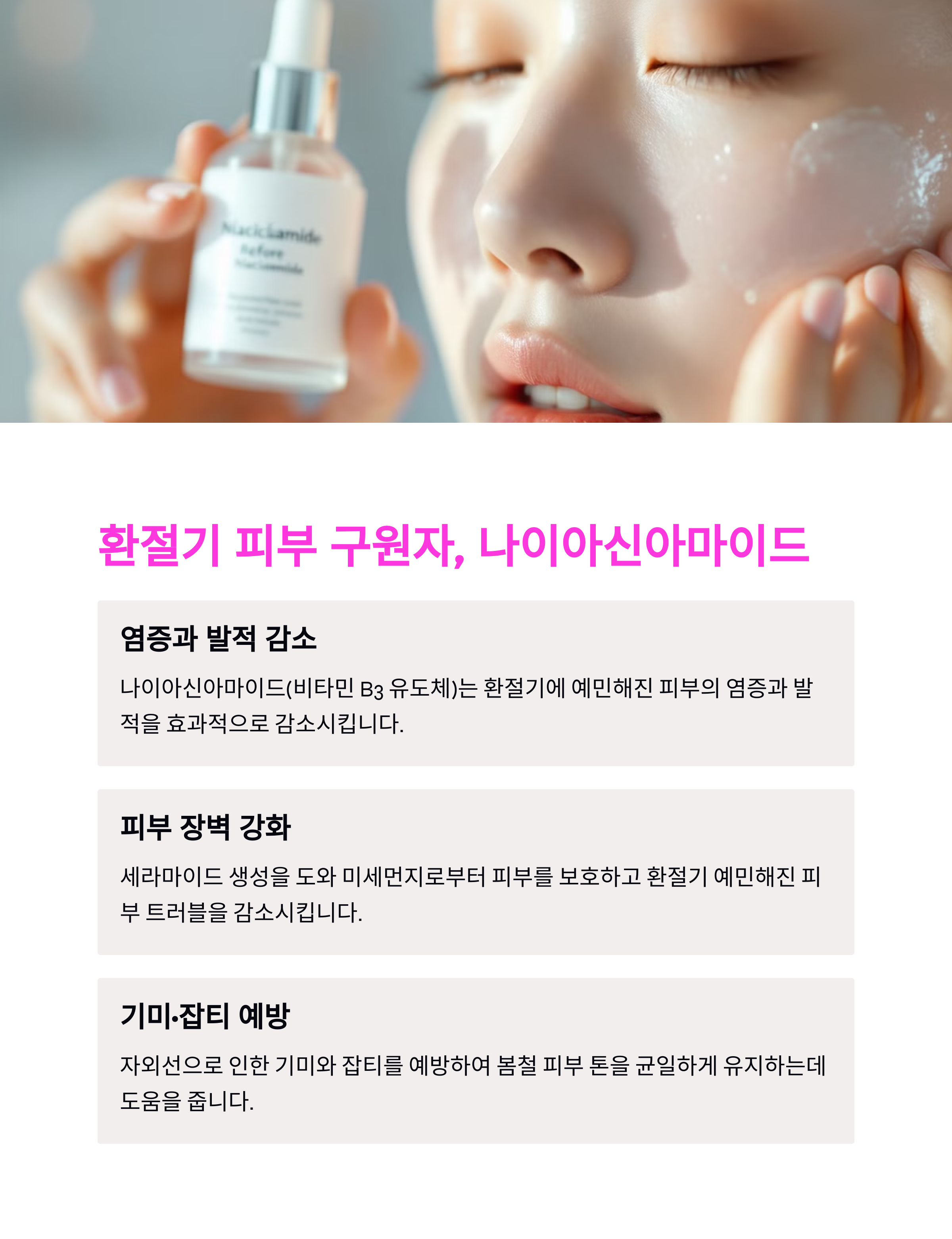 환절기 스킨케어, 봄철 피부관리, 피부과 의사 꿀팁, 환절기 보습, 봄 자외선 차단, 나이아신아마이드, 히알루론산, 비타민C, 피부 장벽 강화, 미세먼지 피부 보호