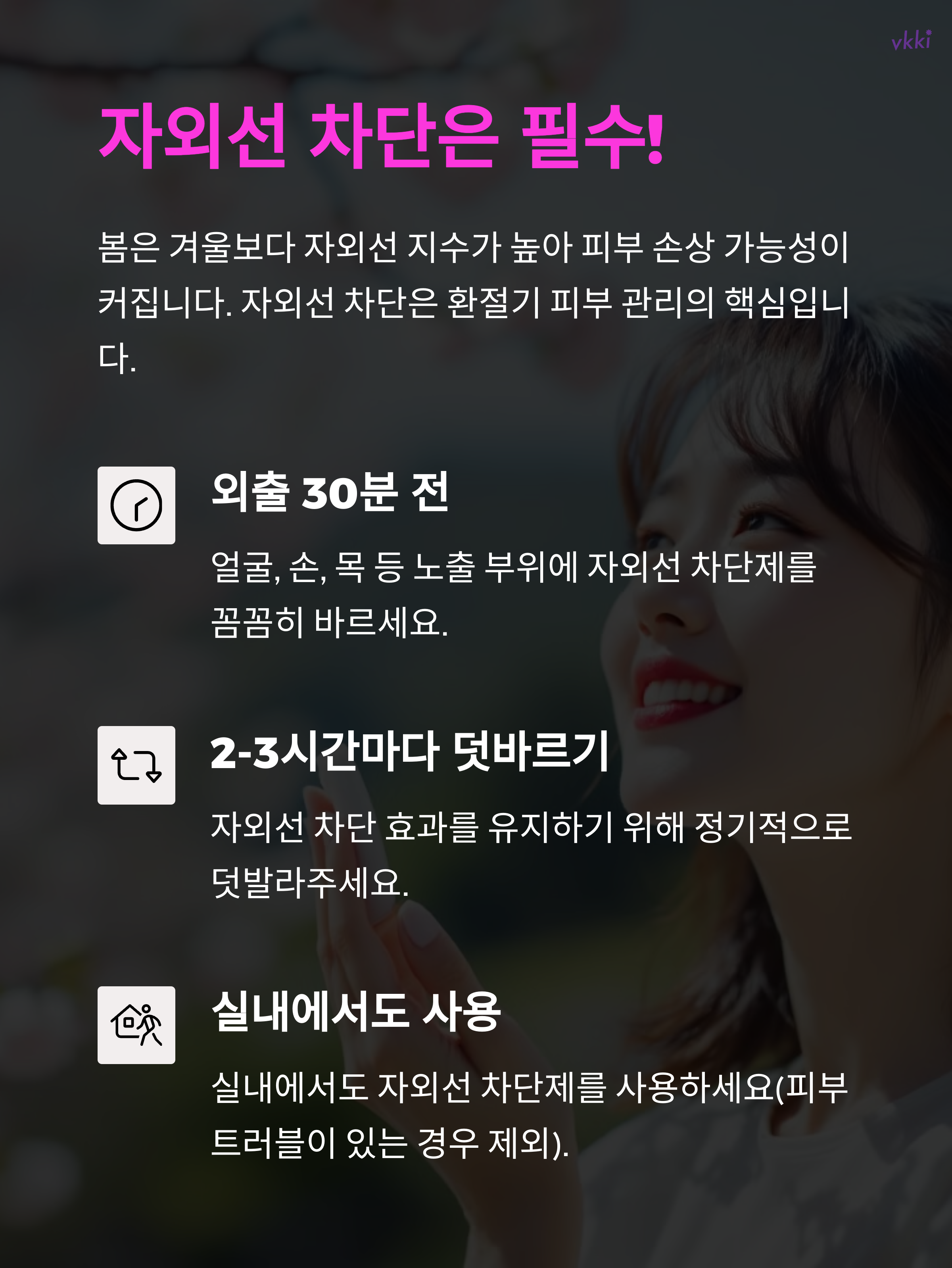 봄은 겨울보다 자외선 지수가 높아 피부 손상 가능성이 커집니다.