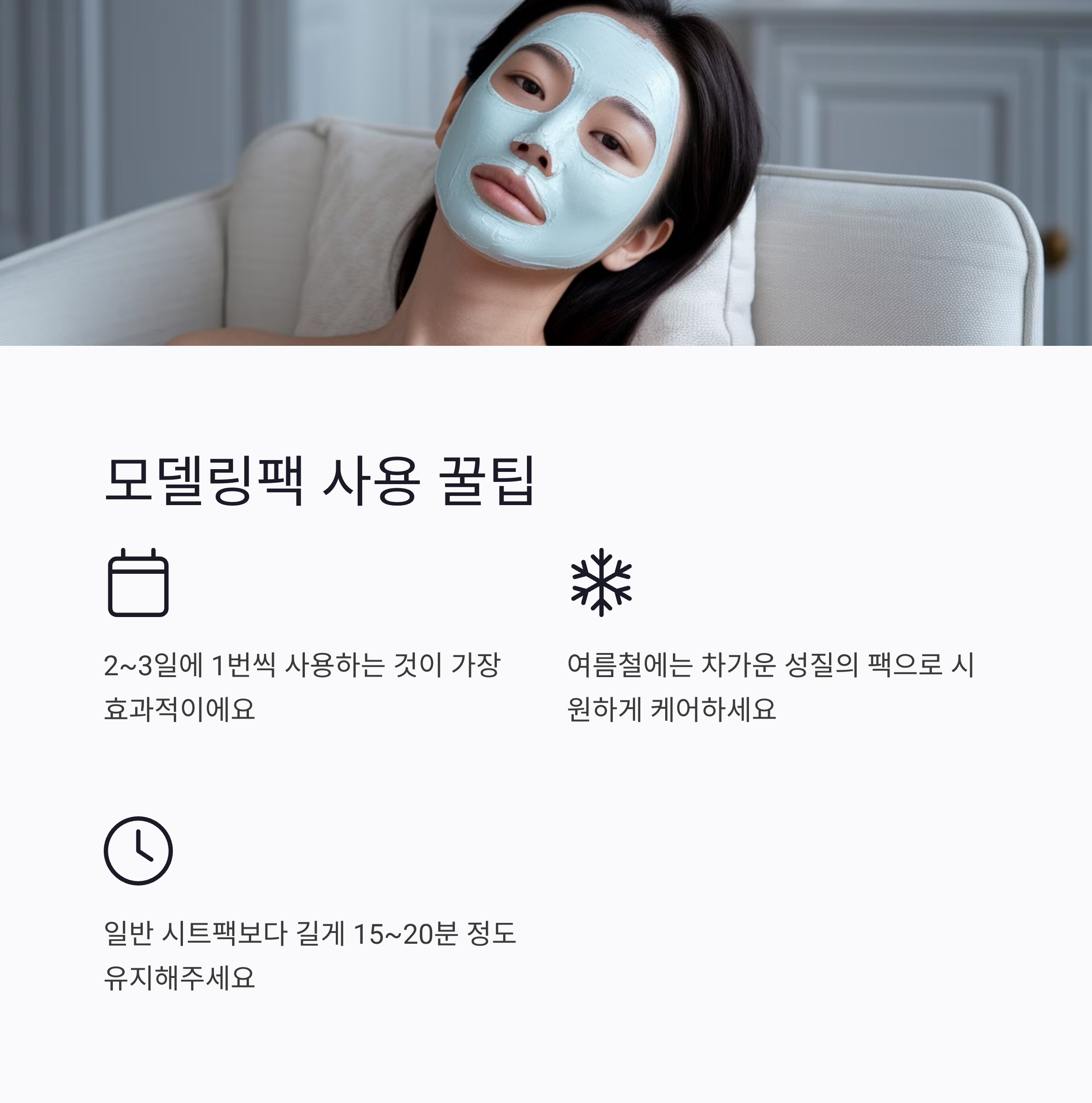 3. 여름철 활용: 차가운 성질의 모델링팩은 덥고 습한 여름에 시원하게 스킨케어하기 좋아요