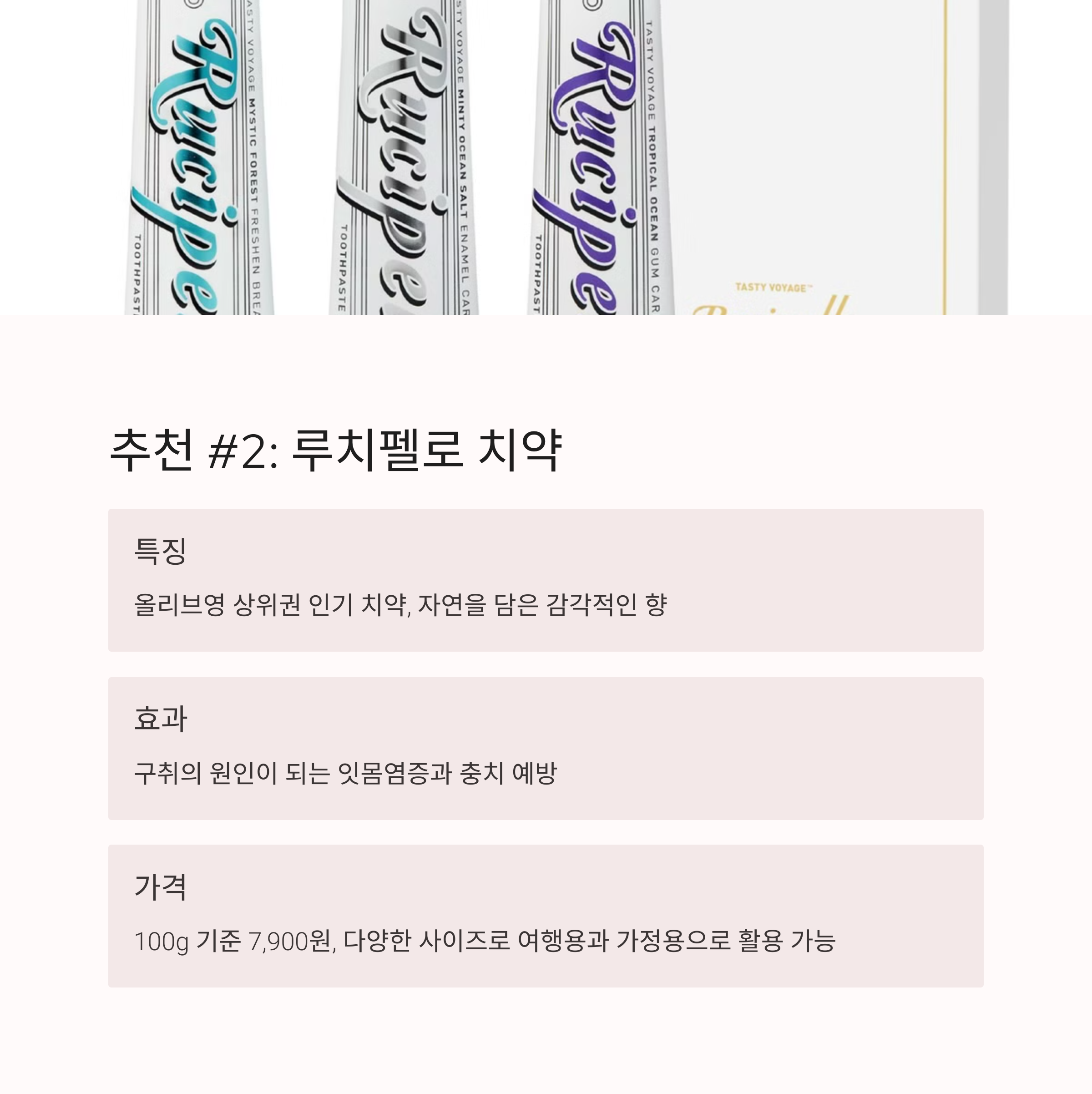 루치펠로는 올리브영에서 상위권 순위를 놓치지 않는 인기 치약입니다. 자연을 담은 감각적인 향으로 산뜻한 느낌을 주며, 특별한 처방으로 구취의 원인이 되는 잇몸염증과 충치를 예방해줍니다.