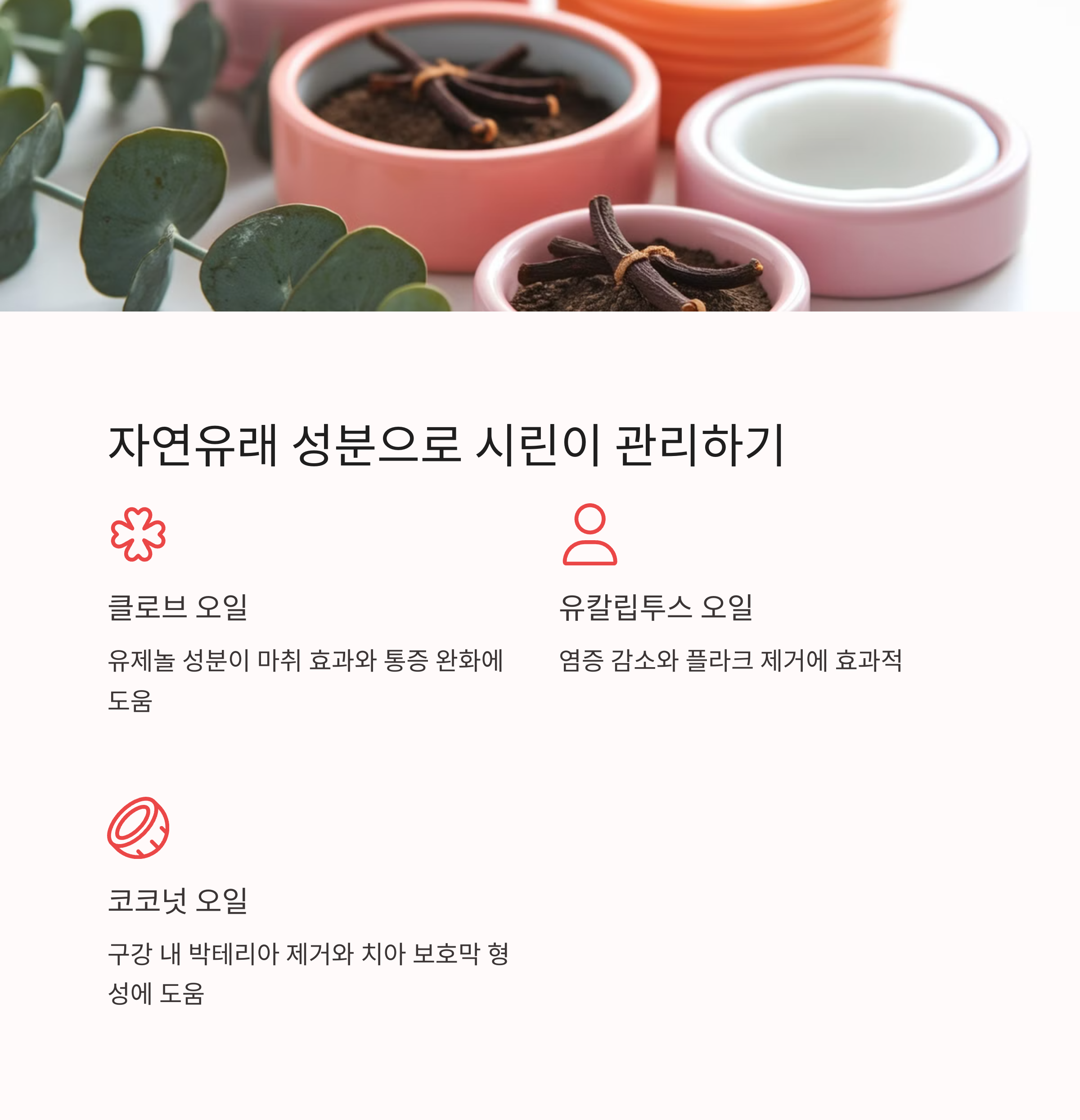 • 유칼립투스 오일: 염증 감소와 플라크 제거에 효과적