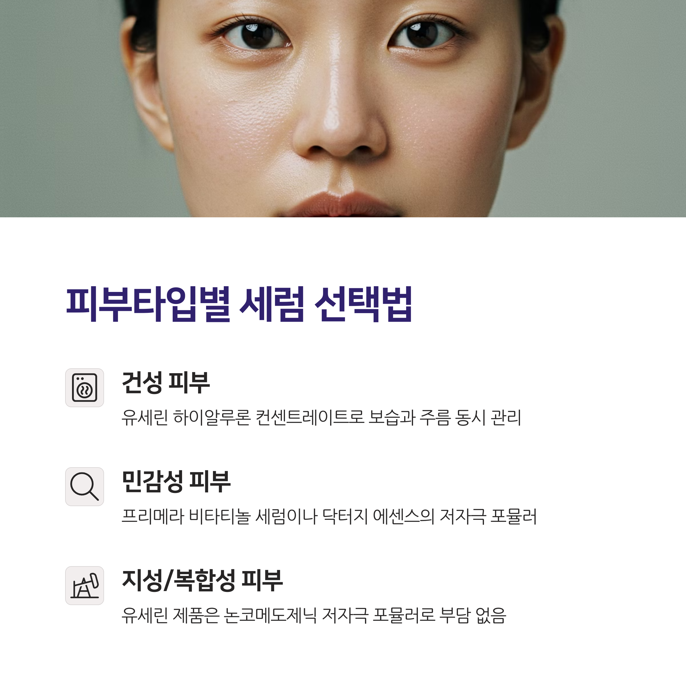 건성 피부: 유세린 하이알루론 컨센트레이트처럼 고농축 히알루론산이 함유된 제품이 좋아요. 보습과 주름 관리를 동시에 할 수 있답니다.