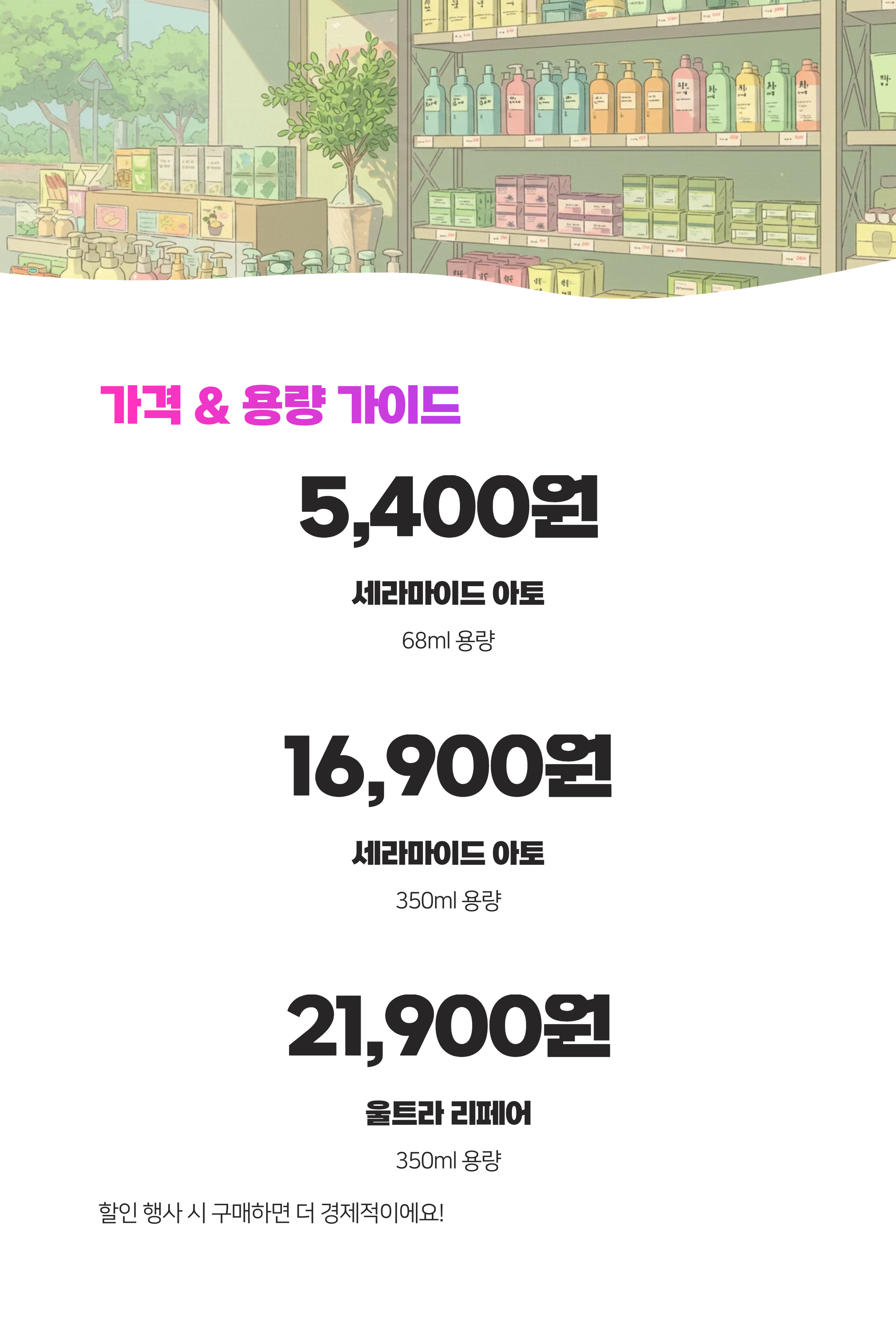 - 세라마이드 아토 로션: 민감성 피부, 무향, 비건, 가볍고 부드러운 마무리