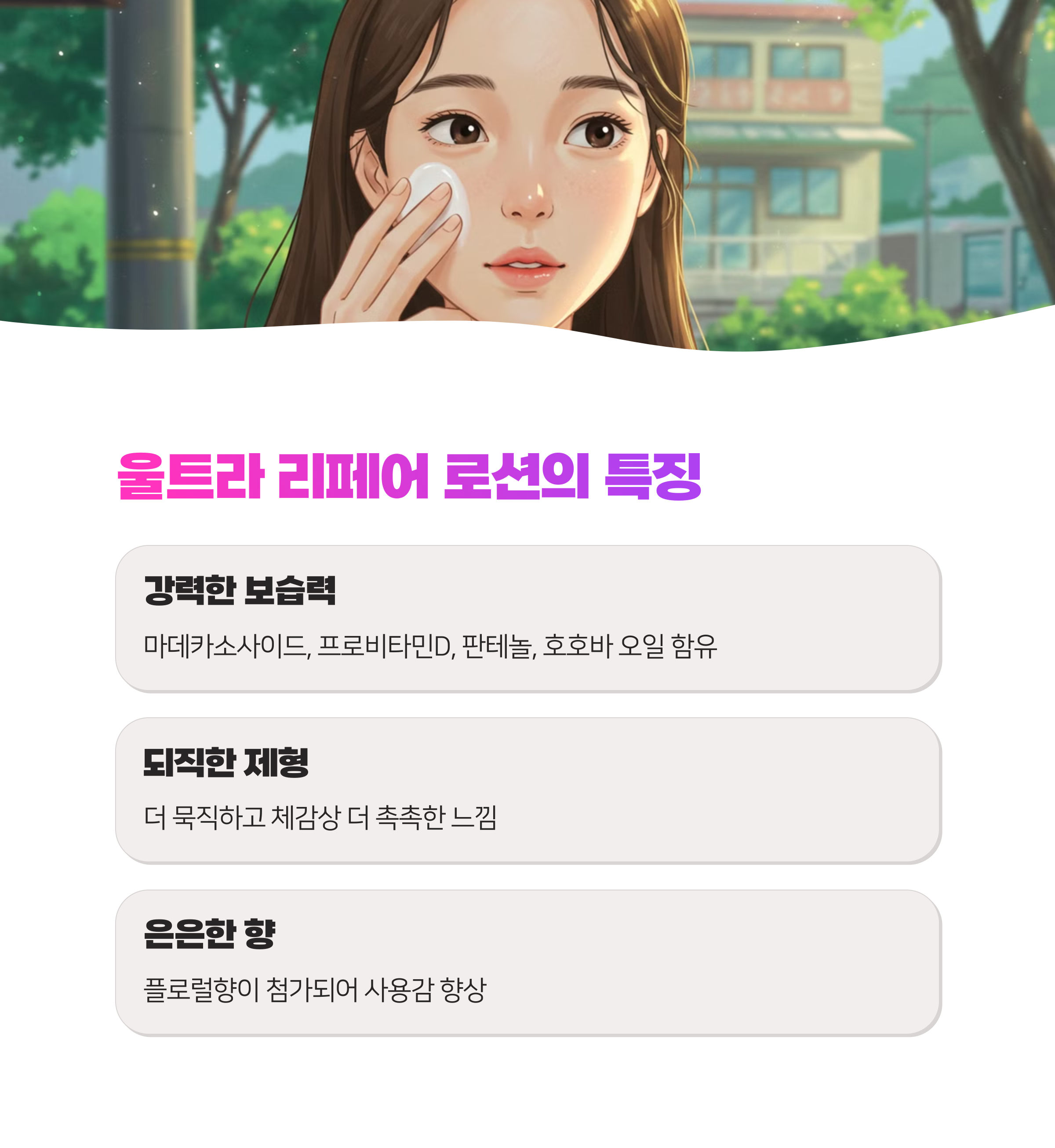 - 울트라 리페어 로션: 악건성, 향 있음, 더 묵직한 보습력, 각질 해결에 탁월