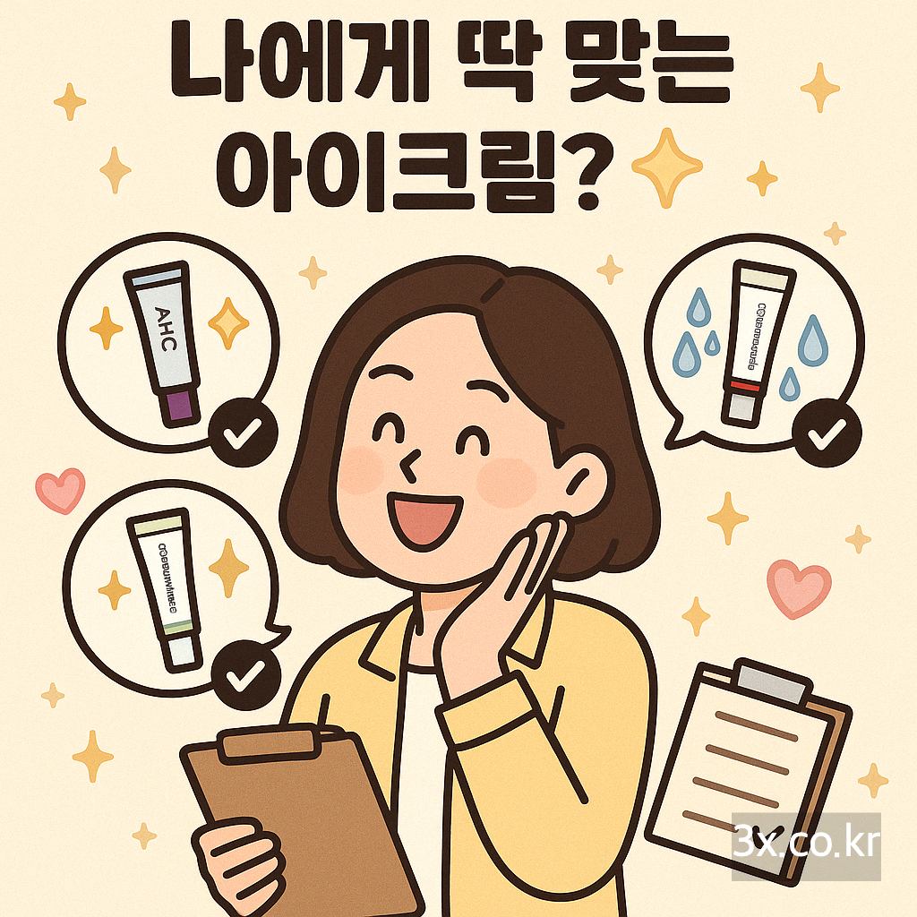 당신의 피부 타입과 눈가 고민에 맞춰, 지금 바로 아이크림 루틴을 시작해보세요! 💫 바르면 바를수록 달라지는 눈가, 거울 속 당신이 더 빛날 거예요 ✨