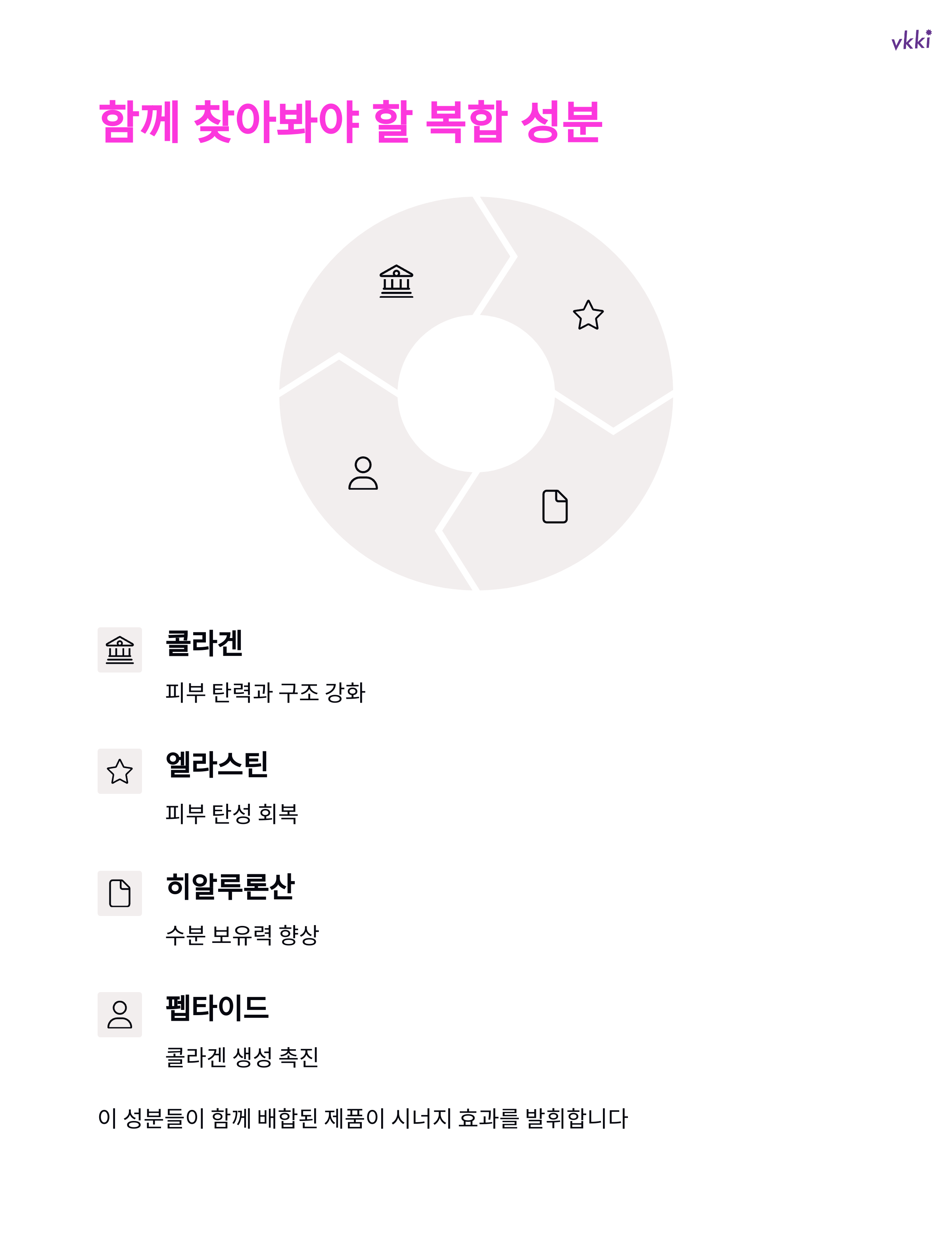 콜라겐뿐만 아니라 엘라스틴, 히알루론산 등 피부 진피층 구성 요소를 함께 배합한 제품이 더욱 효과적이에요.