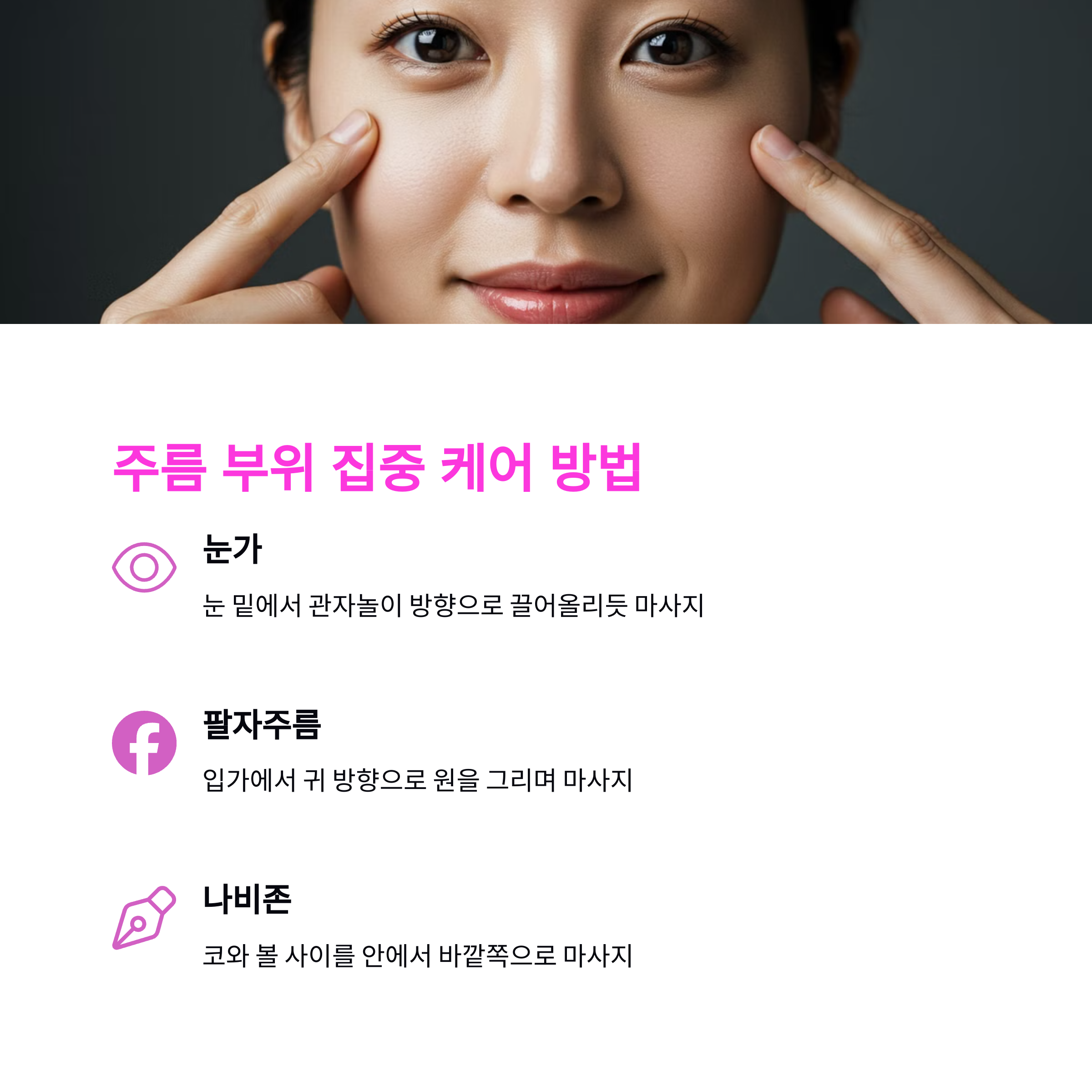 주름이 신경 쓰이는 부위는 여러 번 마사지하며 흡수시키는 것이 효과적이에요. 특히 눈가, 팔자주름, 나비존을 안에서 바깥쪽으로 끌어올리듯 마사지하거나 원을 그리며 흡수시키면 더욱 효과적입니다.
