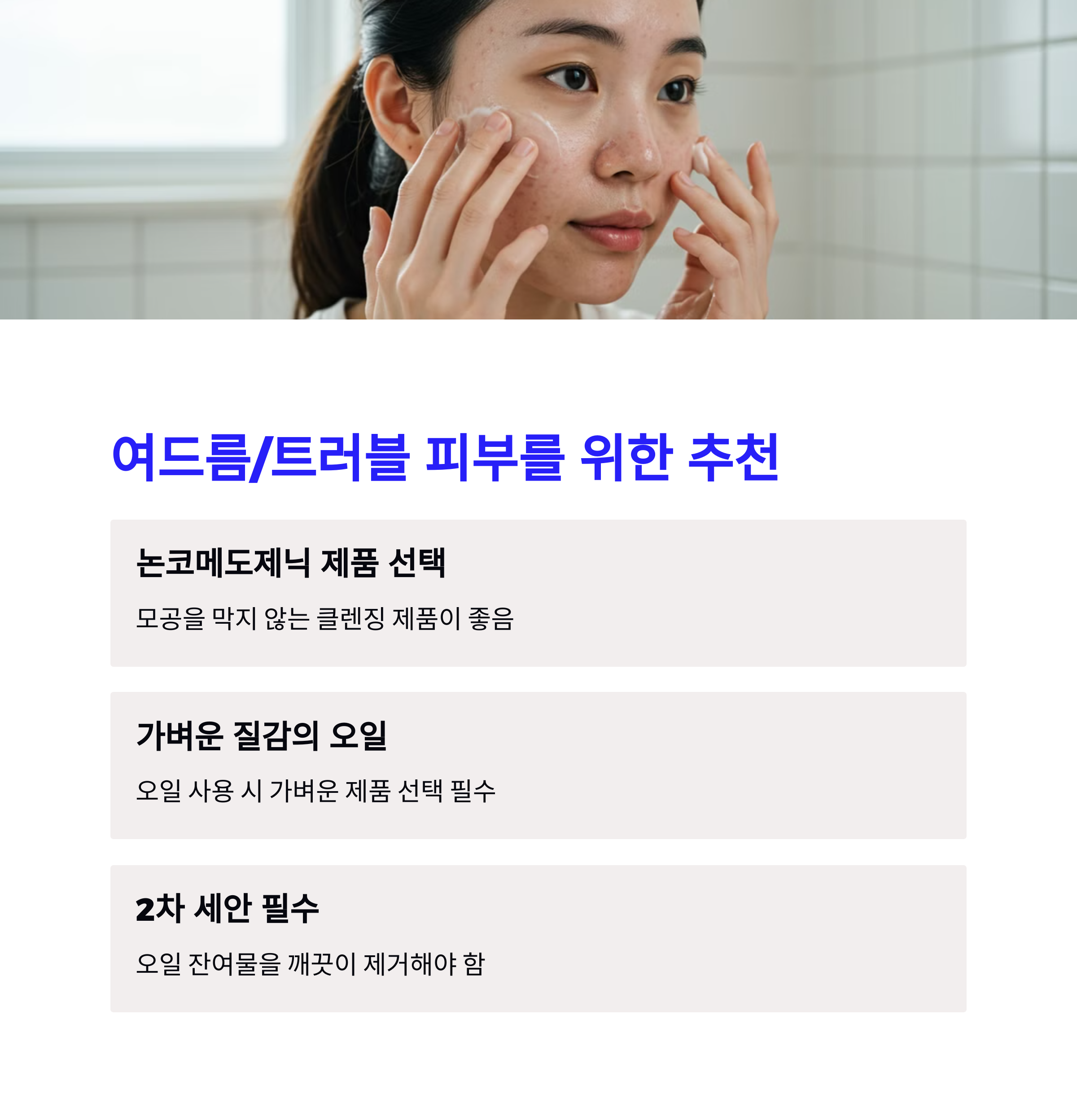 여드름이나 트러블이 있는 피부는 논코메도제닉 클렌징 제품을 선택하는 것이 좋아요. 클렌징 오일을 사용할 경우 가벼운 질감의 제품을 선택하고, 반드시 2차 세안으로 오일 잔여물을 깨끗이 제거해주세요.