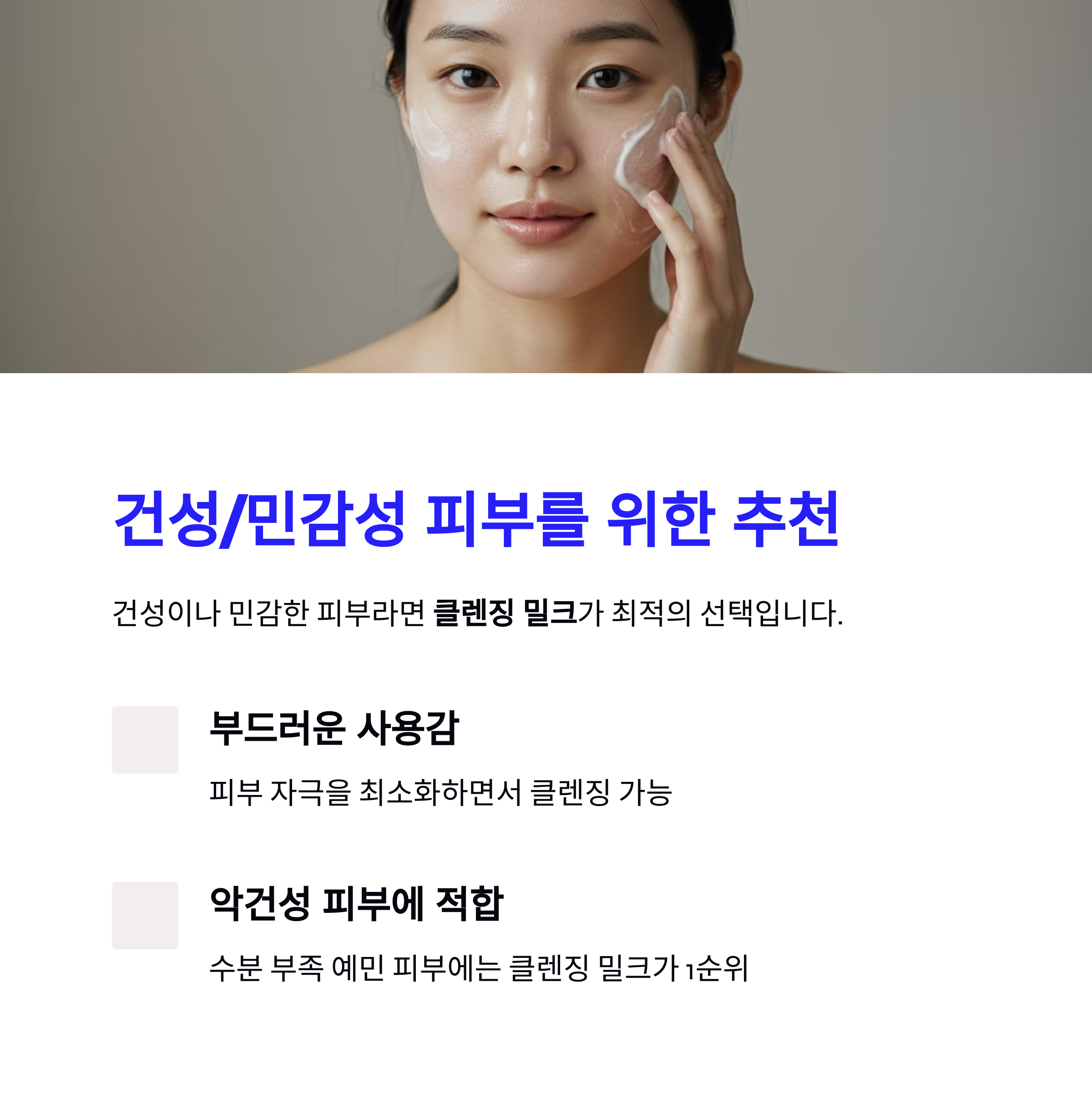 건성이나 민감한 피부라면 클렌징 밀크가 최적의 선택이에요. 부드럽고 촉촉한 사용감으로 피부 자극을 최소화하면서 클렌징할 수 있어요. 특히 악건성 피부, 수분 부족 예민 피부에는 클렌징 밀크가 1순위로 권장돼요.