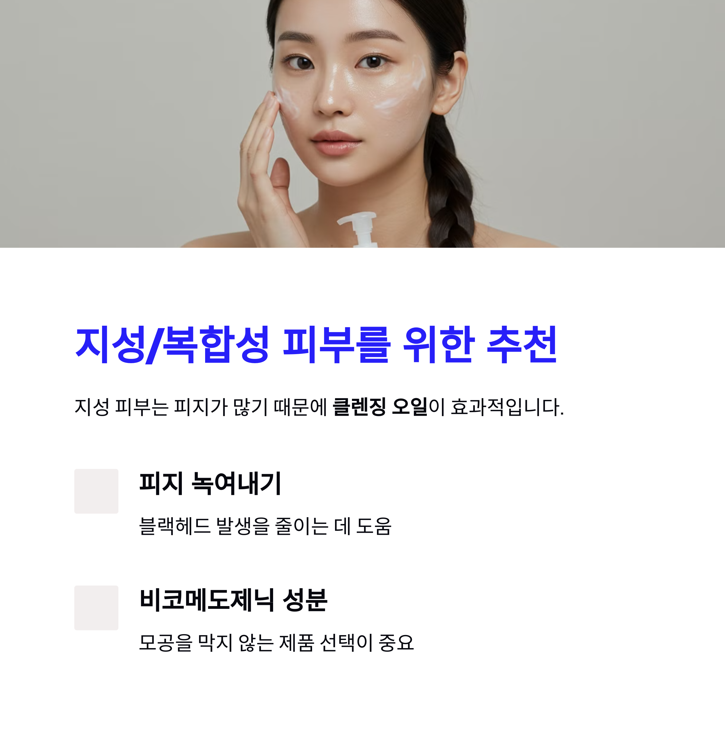 지성 피부는 피지가 많기 때문에 클렌징 오일이 효과적이에요. 피지를 녹여내어 블랙헤드 발생을 줄이고, 보습 성분이 추가된 제품은 건조함도 방지할 수 있어요. 다만, 비코메도제닉(모공을 막지 않는) 성분이 포함된 제품을 선택하는 것이 중요해요.