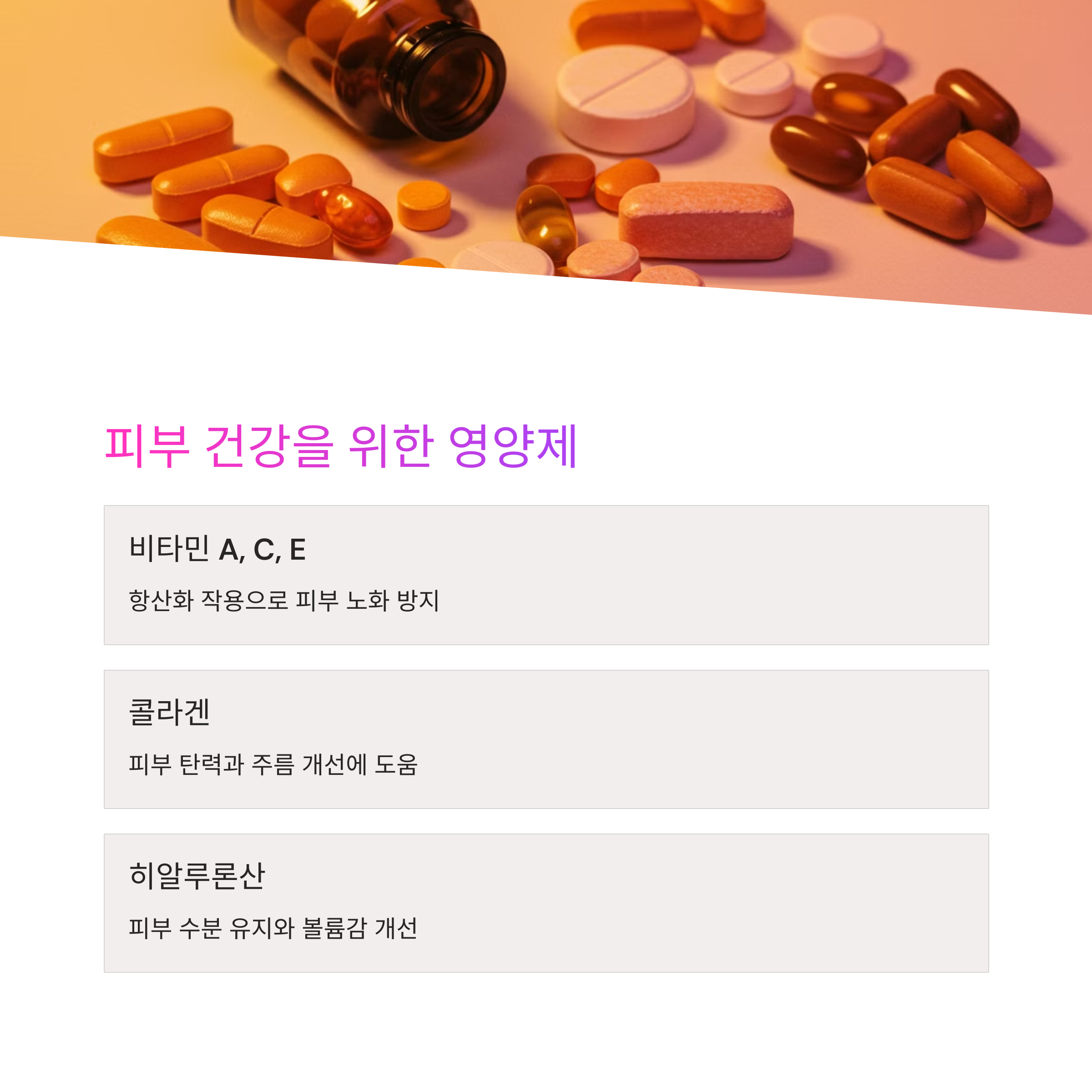 피부 건강을 지원하기 위해 비타민 A, C, E, 아연 등을 함유한 영양제를 섭취하는 것도 좋은 방법입니다. 또한 콜라겐, 엘라스틴, 히알루론산과 같은 피부 진피 3요소를 섭취하면 피부 탄력 유지에 도움이 됩니다.