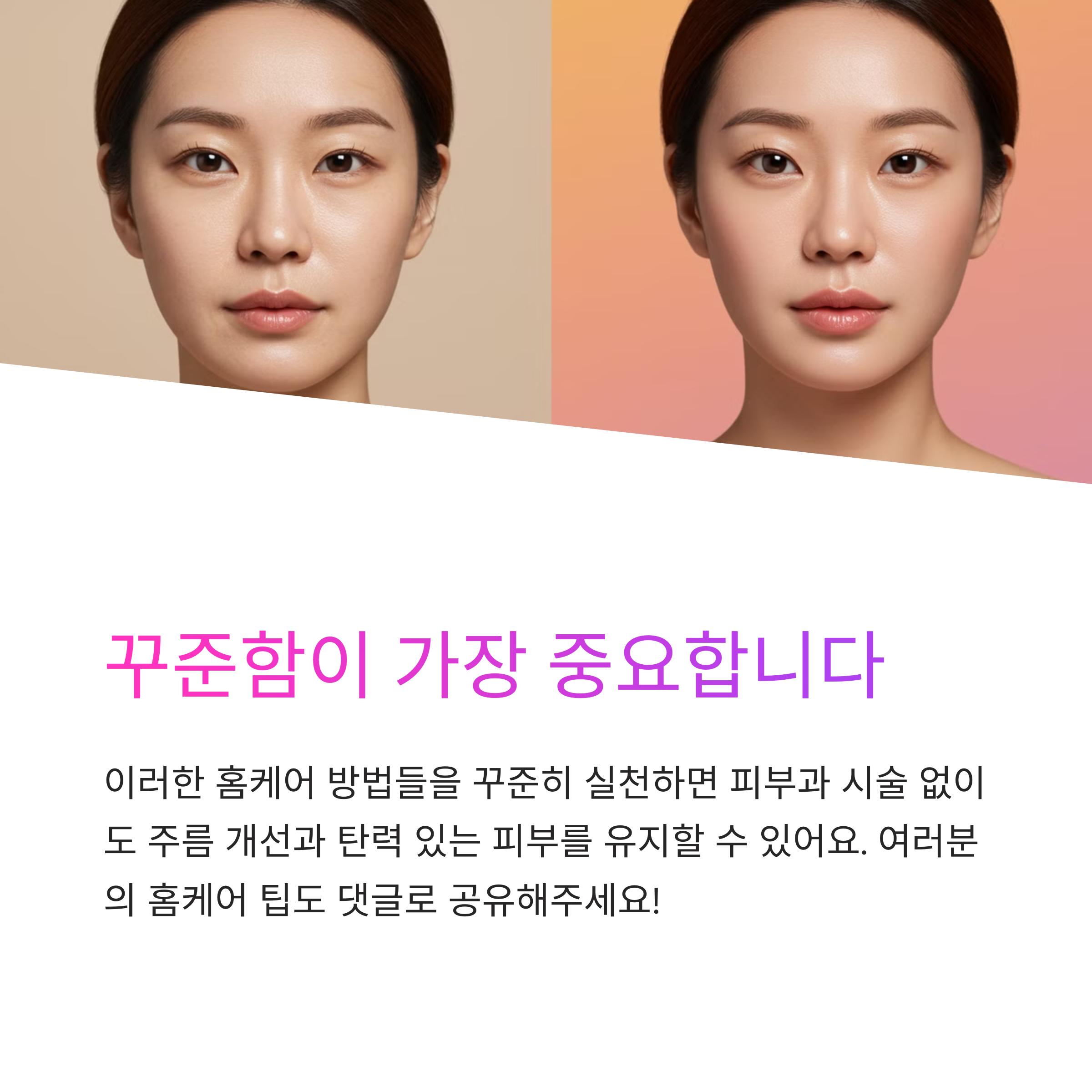 홈케어 루틴은 꾸준함이 가장 중요합니다. 이러한 방법들을 꾸준히 실천하면 피부과 시술 없이도 주름 개선과 탄력 있는 피부를 유지할 수 있어요. 하지만 심각한 주름이나 피부 문제가 있다면 피부과 전문의와 상담하는 것이 좋습니다.