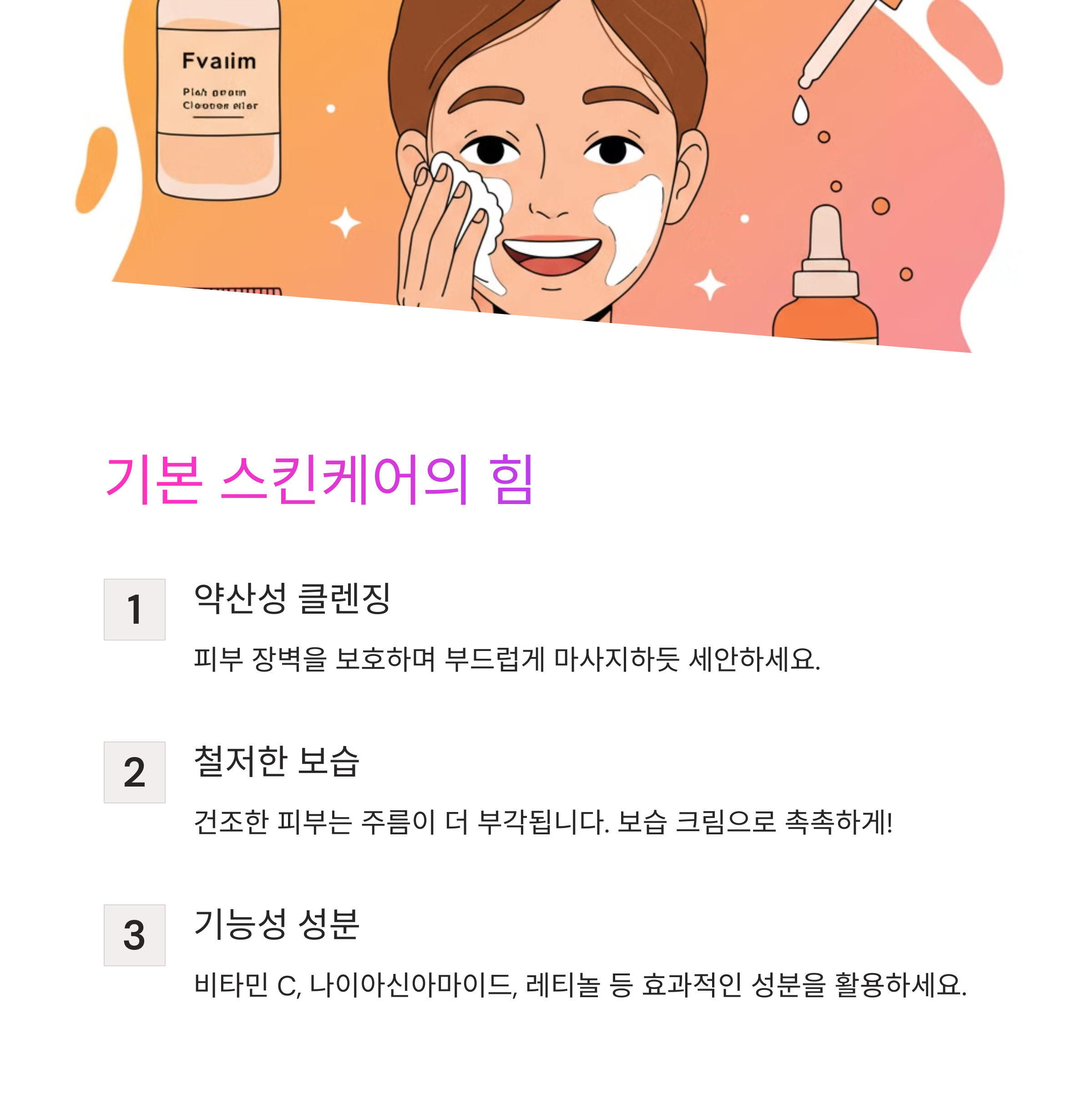 피부 노폐물을 제거하고 깨끗하게 유지하는 것이 중요합니다. 약산성 폼클렌징을 사용하여 피부 장벽을 보호하면서 세안하세요. 세게 문지르지 말고 부드럽게 마사지하듯 클렌징하는 것이 좋습니다.