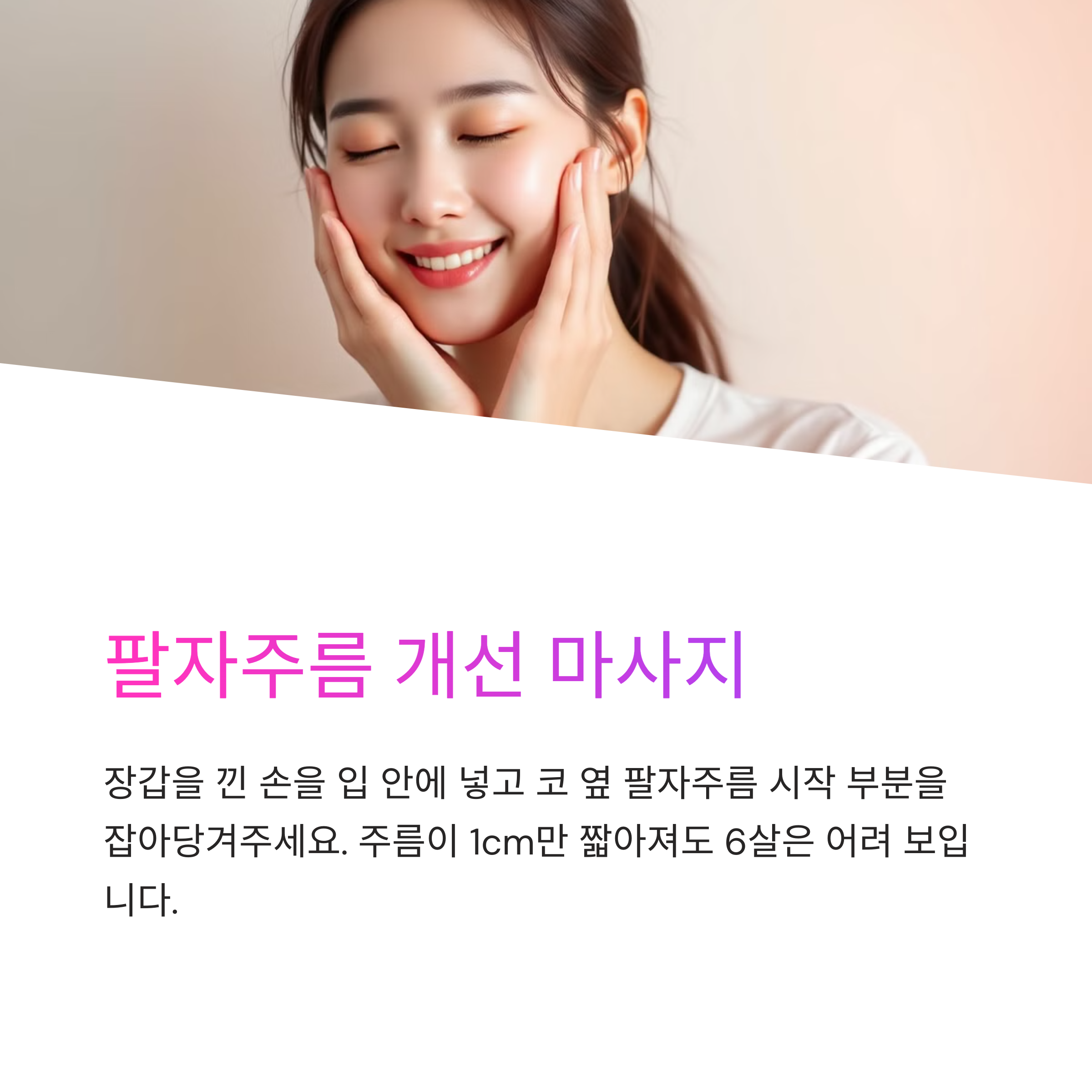 장갑을 낀 손을 입 안에 넣고 팔자주름이 시작되는 코 옆 부분을 잡고 당겨주세요. 주름이 1cm만 짧아져도 6살은 어려 보인다고 합니다.