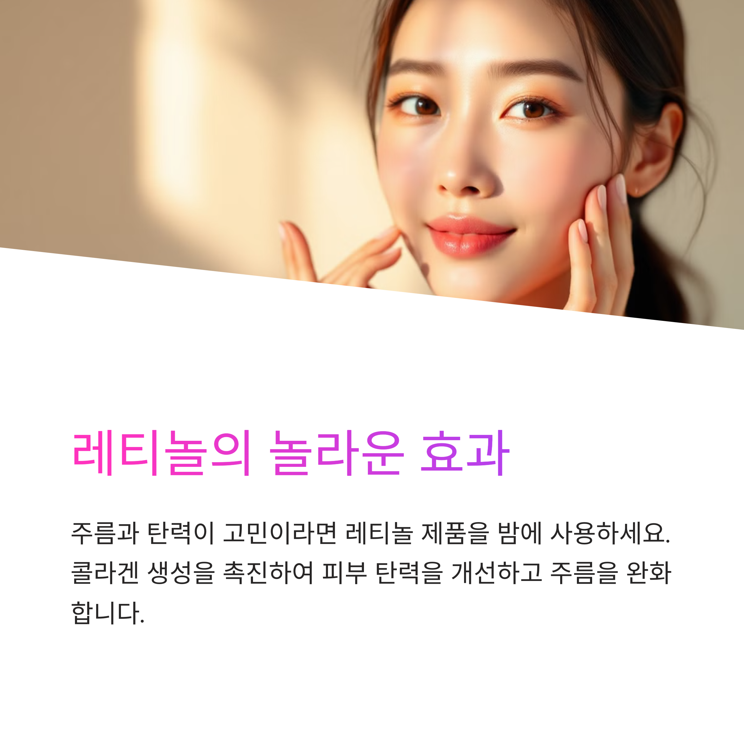 - 레티놀: 주름과 탄력이 고민이라면 레티놀이 함유된 제품을 밤에 사용하세요. 콜라겐 생성을 촉진하여 피부 탄력을 개선합니다.