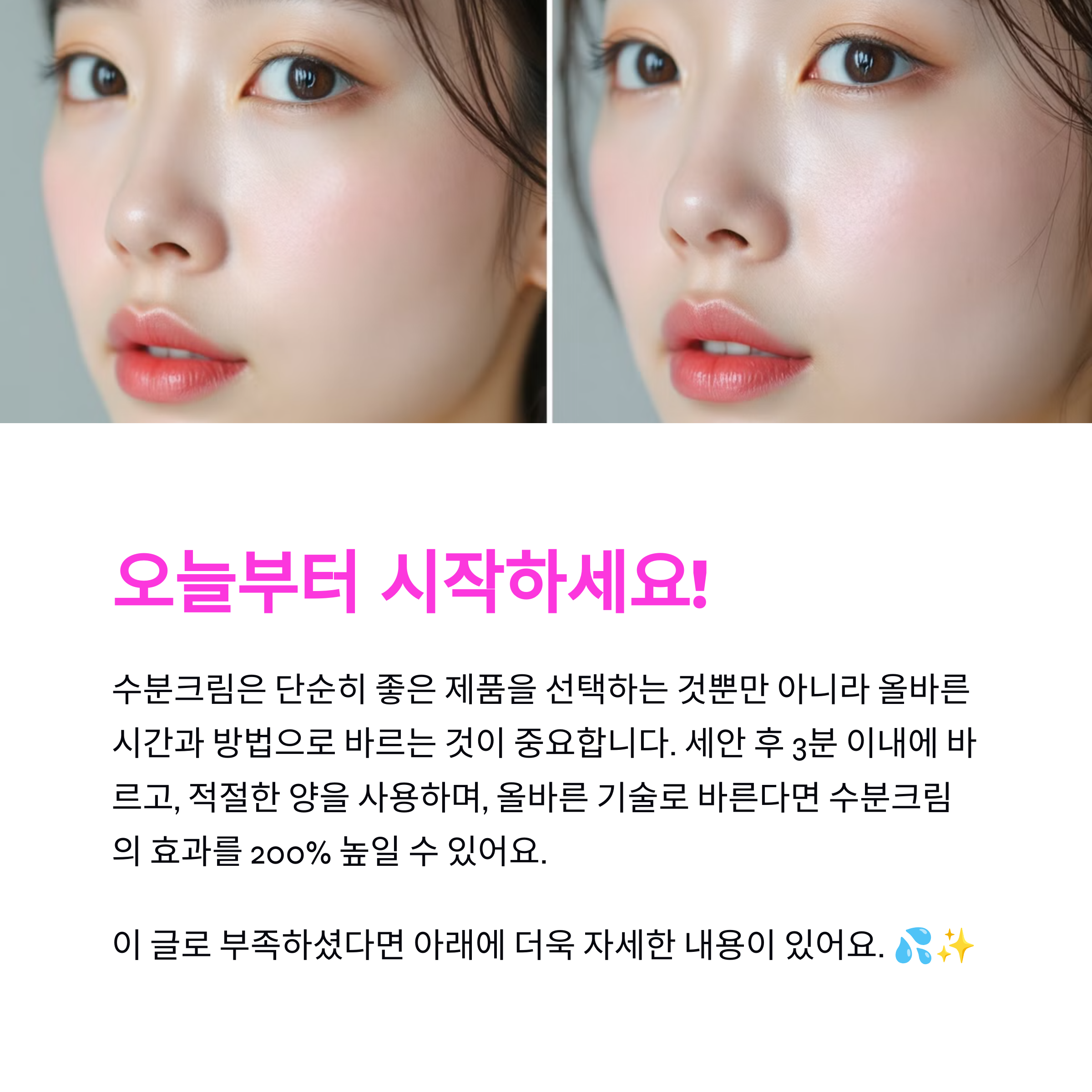 수분크림은 단순히 좋은 제품을 선택하는 것뿐만 아니라 올바른 시간과 방법으로 바르는 것이 중요합니다. 세안 후 3분 이내에 바르고, 적절한 양을 사용하며, 올바른 기술로 바른다면 수분크림의 효과를 200% 높일 수 있어요.