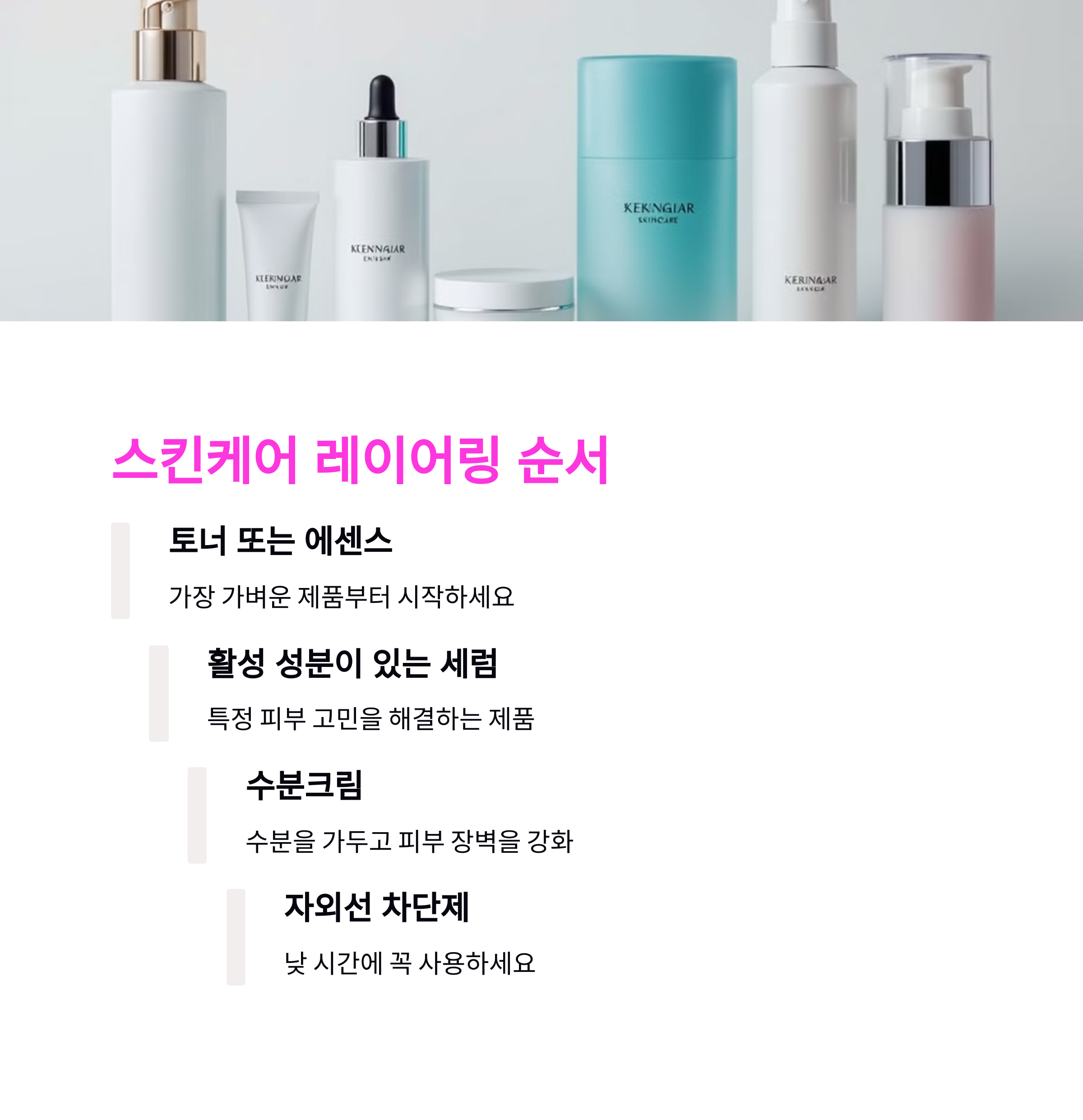 스킨케어 제품의 순서는 효과에 큰 차이를 만듭니다. 연구에 따르면 분자량이 가장 가벼운 제품부터 시작해 무거운 제품 순으로 레이어링하는 것이 좋습니다.