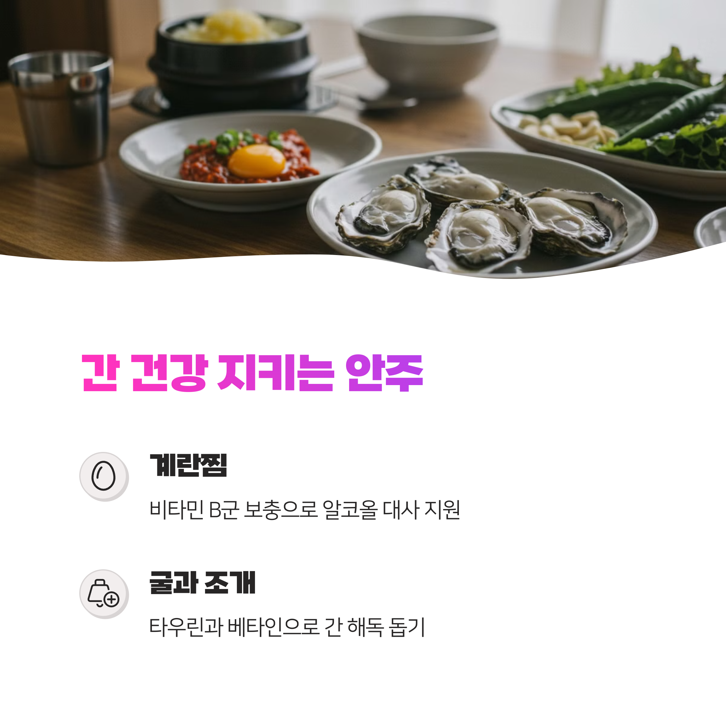 알코올 대사에는 비타민 B군이 필수적이며, 이는 계란찜이나 생밤 같은 안주를 통해 보충할 수 있습니다. 특히 계란찜은 소화가 잘 되고 부드러운 식감으로 술자리에서 부담 없이 즐길 수 있는 선택입니다.