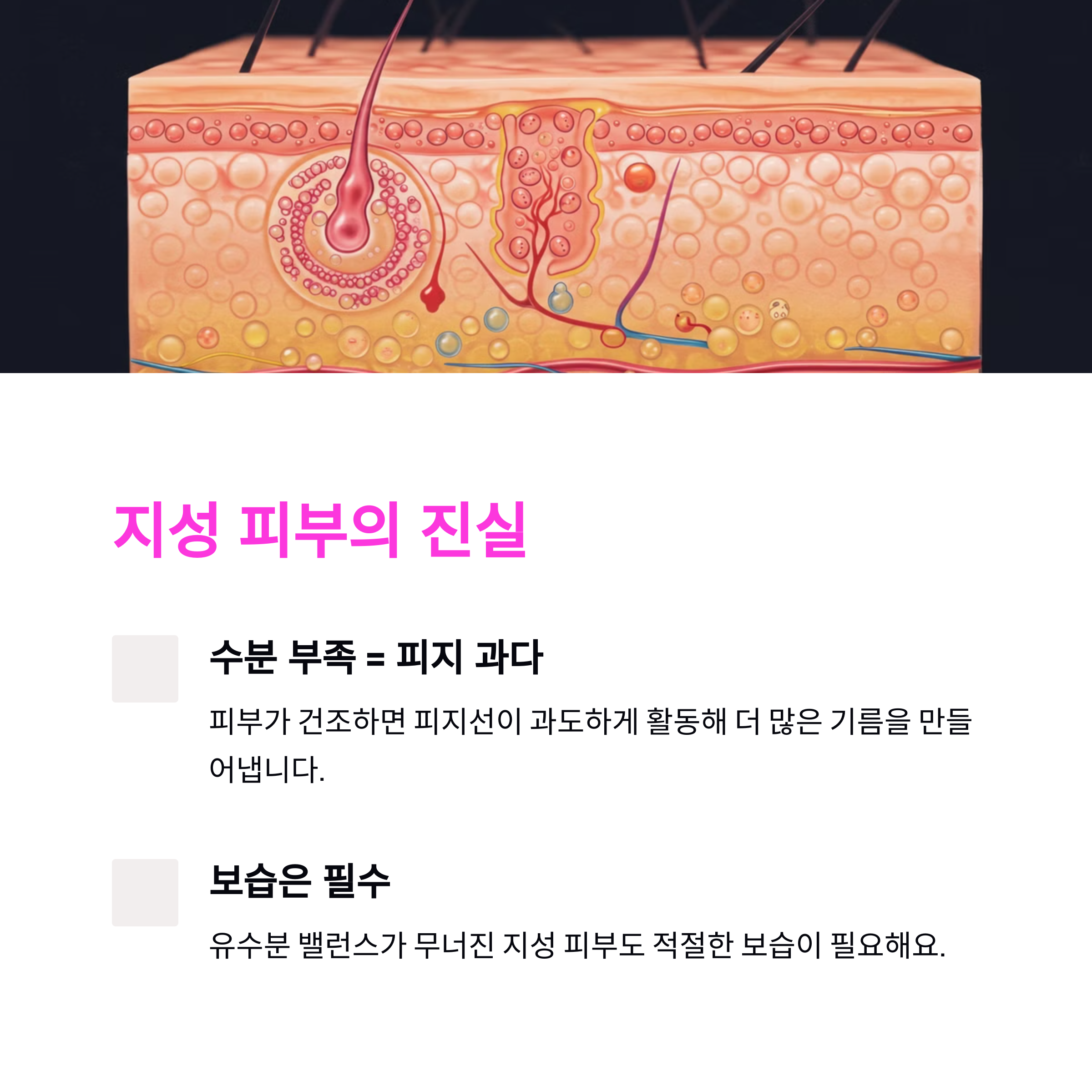많은 분들이 오해하시는 것과 달리, 지성 피부도 수분크림이 꼭 필요해요. 적절한 수분 공급은 오히려 과다한 피지 분비를 줄이는 데 도움이 됩니다. 피부가 건조하다고 느끼면 피지선이 과도하게 활동해 더 많은 기름을 만들어내기 때문이에요.