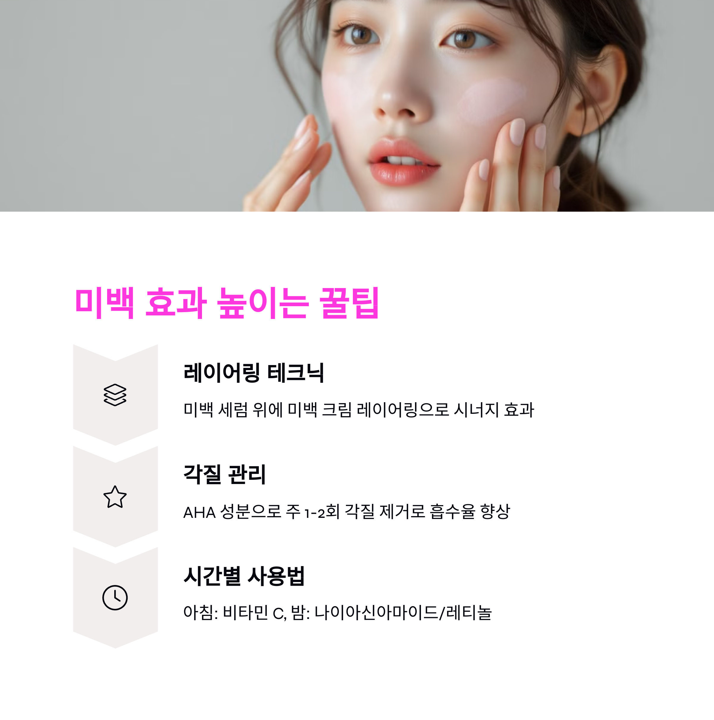미백 세럼 위에 미백 크림을 레이어링하여 사용하면 시너지 효과를 볼 수 있어요. 특히 밤에는 집중 케어를 위해 세럼과 크림을 함께 사용하는 것이 좋습니다.