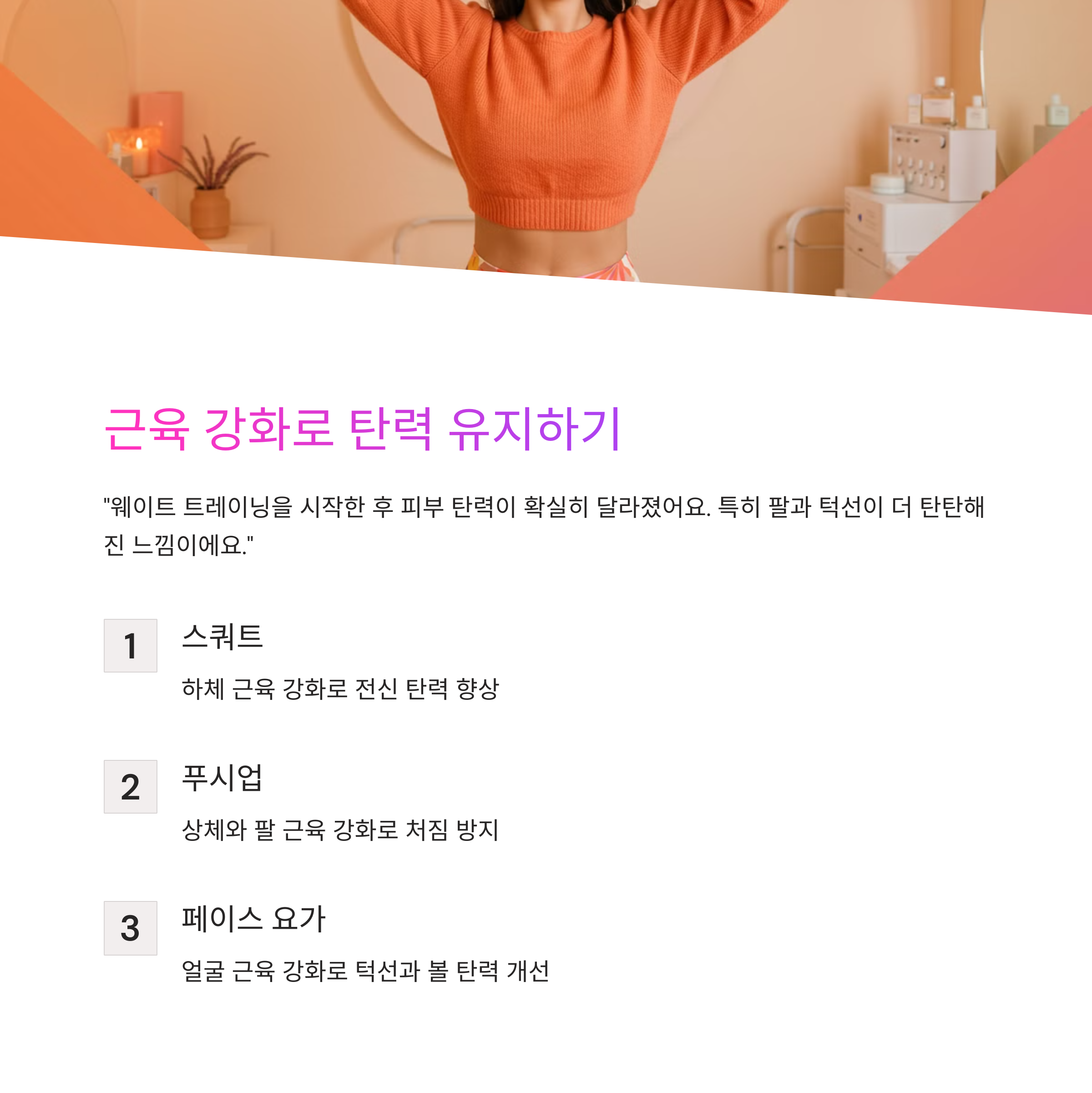 피부는 근육 위에 덮인 캔버스와 같아요. 근력 운동을 통해 근육을 강화하면 피부의 '프레임'을 튼튼하게 하여 처짐을 최소화할 수 있어요.