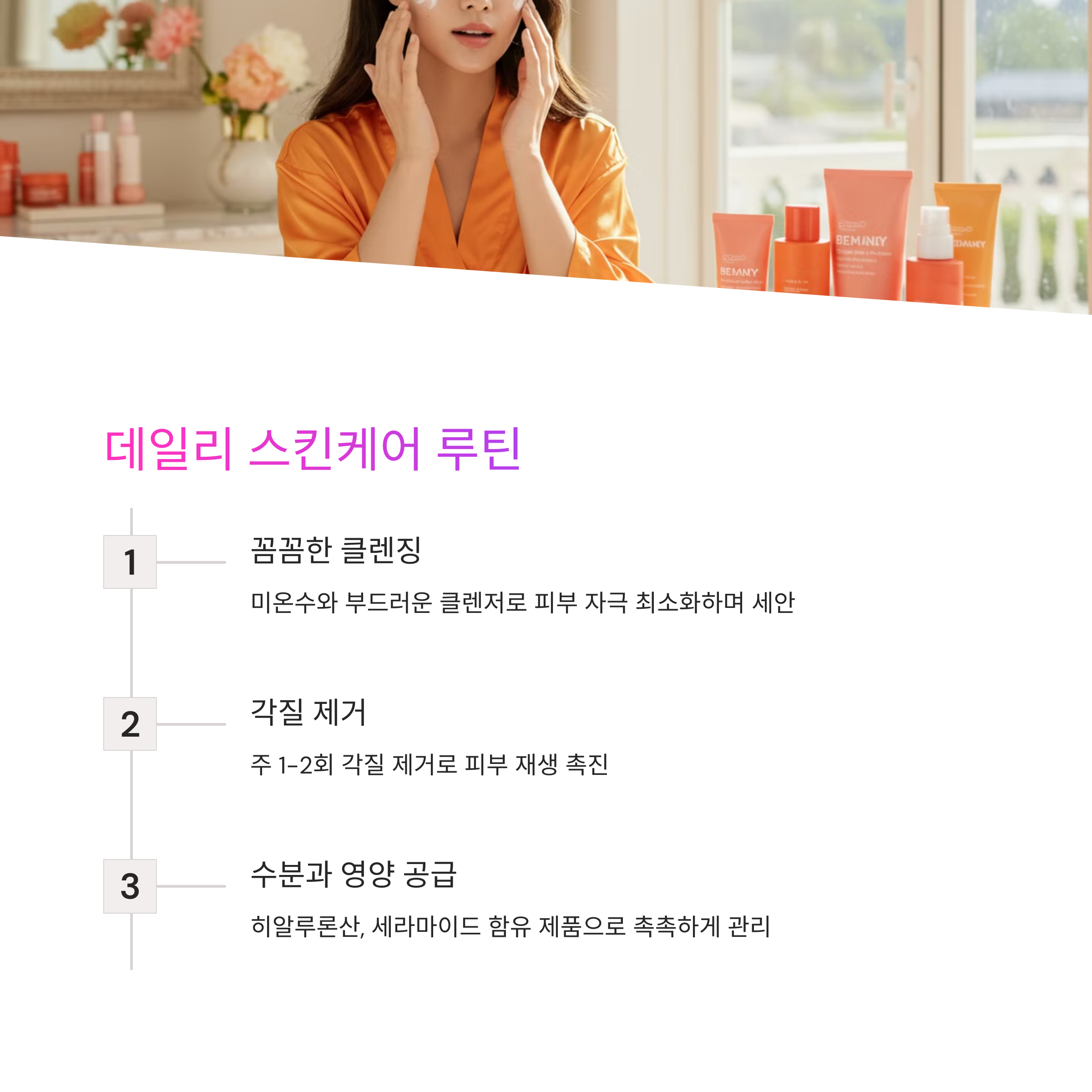 아침과 저녁에 피부를 깨끗하게 세안하는 것이 중요해요. 미온수와 부드러운 클렌저를 사용해 피부 자극을 최소화하면서 오염물질을 제거해주세요.